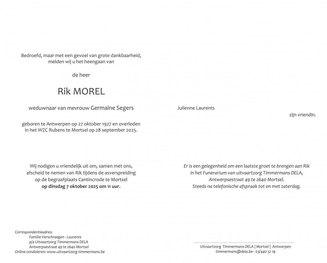 We vernamen het droeve nieuws dat afgelopen zondagavond Henri 'Rik' Morel overleden is op de gezegende leeftijd van 97 jaar.